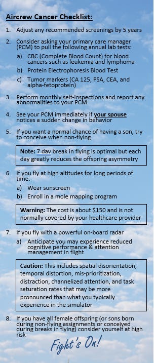 The truth is, not as well as we should. It’s true that regular medical screening and generally motivated people with access to good healthcare support, means that actually mortality due to cancer is little different in aircrew and the background population. But, eliminating the radiation, which most people assume is causing that cancer, is much harder. We can’t help that aeroplanes fly well above the ground, nor that combat aircraft and airliners alike have big radars in the front creating ionizing radiation. Adding extensive radiation shielding would make aeroplanes problematically heavy. Probably the best that we can do is to limit duty hours, and to enhance medical screening - which unfortunately we haven’t generally done. There is a military oriented charity in the USA, Aces and Eights, who I have mentioned before, who are doing something - but in the rest of the world, not a lot.
