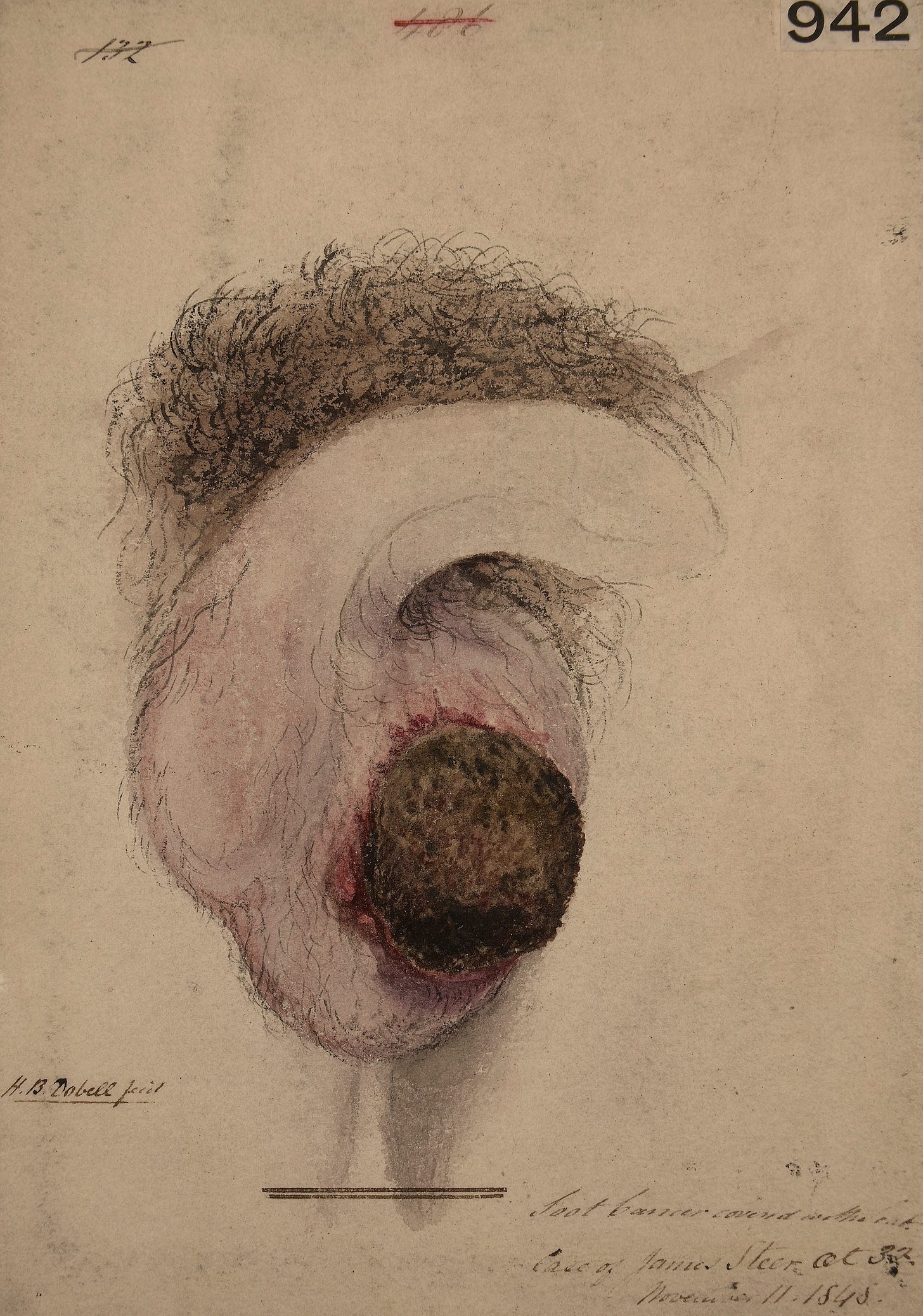 (Watercolour of chimney sweep’s cancer tumour, by Horace Henge Dobell.)